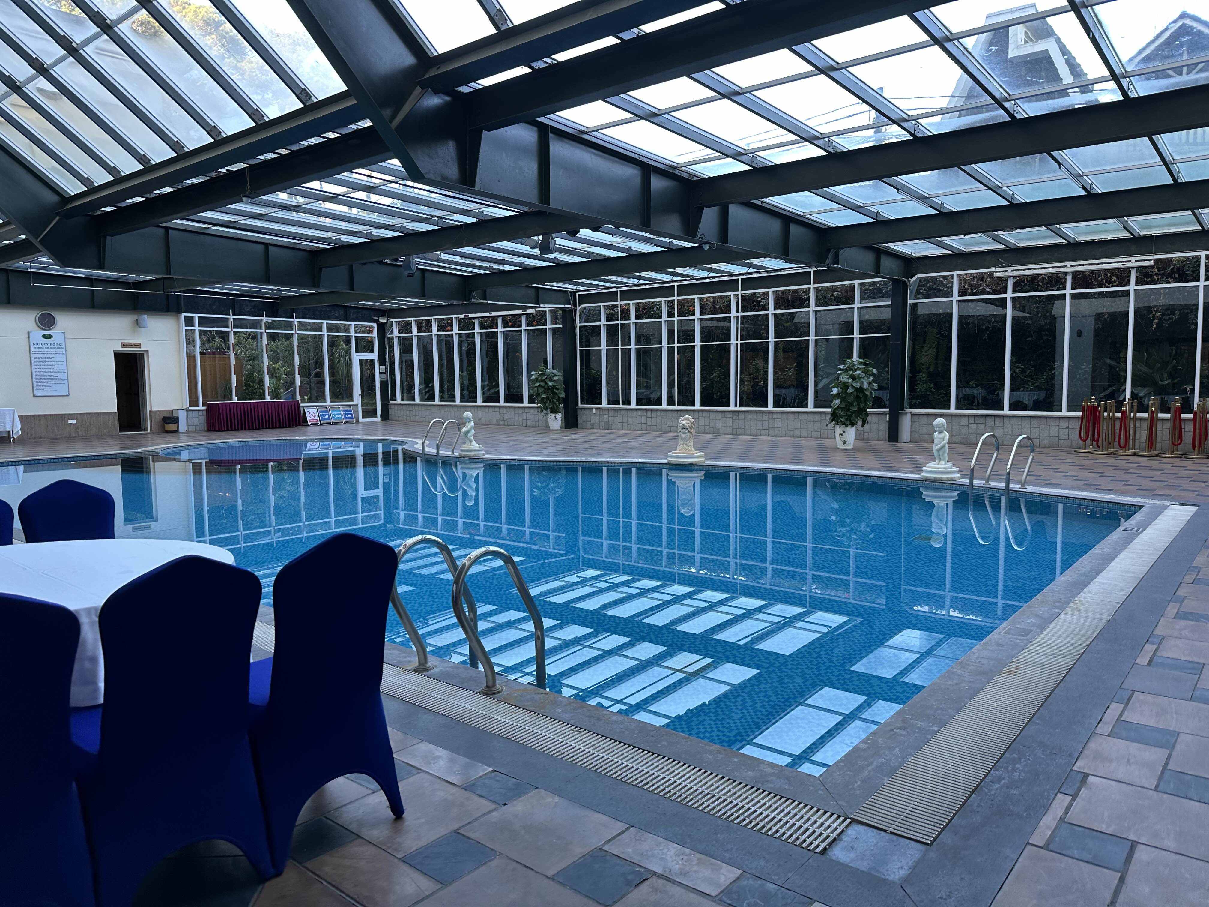 식당 옆에 수영장이 있는데 아무도 수영하는 사람은 없었습니다